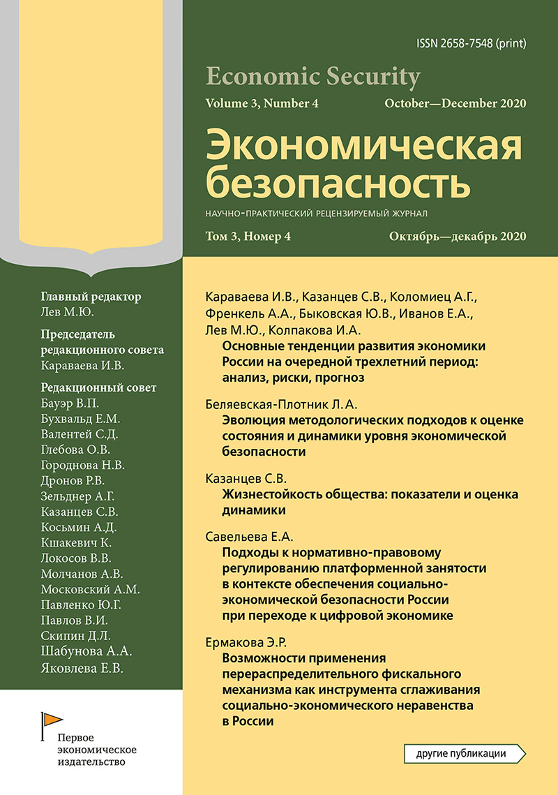 Economic security - peer-reviewed journal devoted to modern tools and methods of economic security research from basic science to practical implementation and application in various economic sectors.The main topics include the following issues: national and state economic interests and goals of Russia, defense and industrial security, international and foreign economic security, financial, energy, socio-economic and food security, as well as economic security of state competitiveness, economic security of business activity and monitoring of economic security indicators.