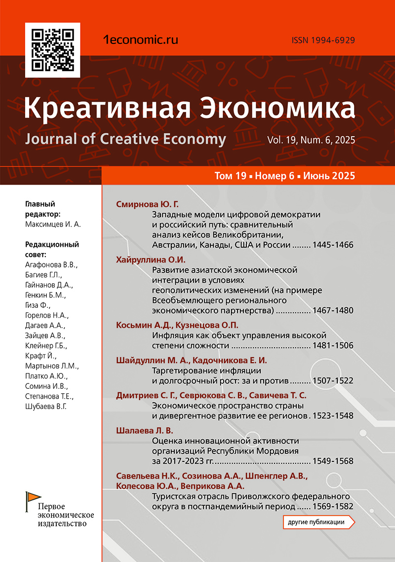 The Journal of Creative Economy is dedicated to studying the aspects of economic creativity as a source for economic growth mechanisms and innovations developing. The journal deals with institutional and macroeconomic issues such as knowledge management, development of human and intellectual capital, innovational development of the state and regions, formation of a national innovation system, and also with various practical aspects, including leadership and innovation management. Special attention is paid to the issues of creative and innovatively active professionals training at the institutions of higher and vocational education. The main content of the journal includes analytical reviews and the results of original scientific studies.The journal may be of interest to researchers in the field of economics and other industries, scholar students, business leaders, economists, and government officials.