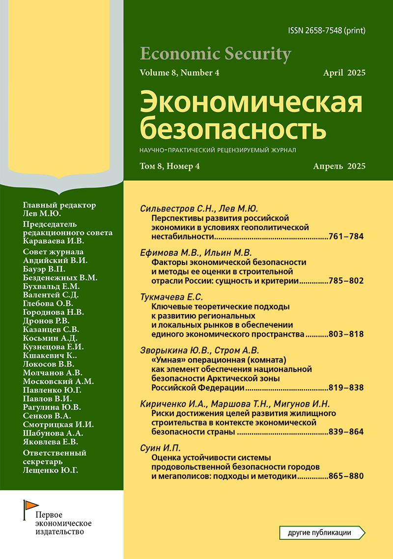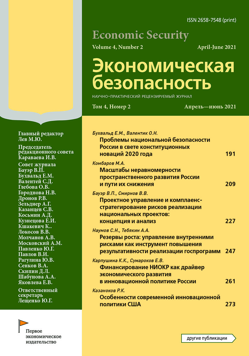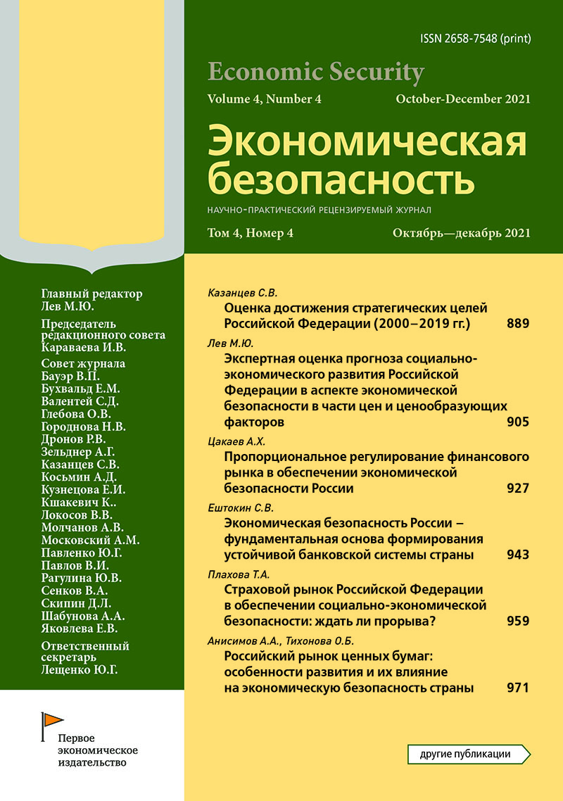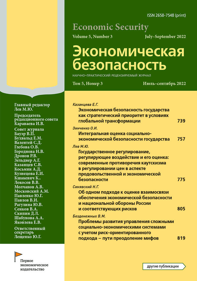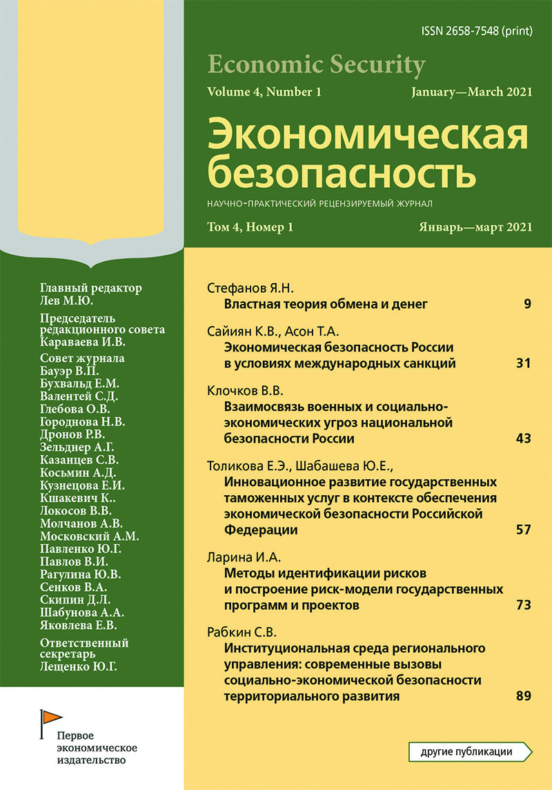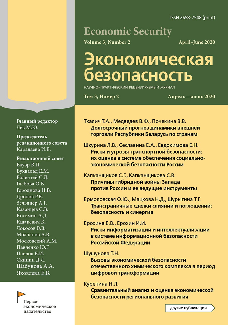 Economic security - peer-reviewed journal devoted to modern tools and methods of economic security research from basic science to practical implementation and application in various economic sectors.The main topics include the following issues: national and state economic interests and goals of Russia, defense and industrial security, international and foreign economic security, financial, energy, socio-economic and food security, as well as economic security of state competitiveness, economic security of business activity and monitoring of economic security indicators.