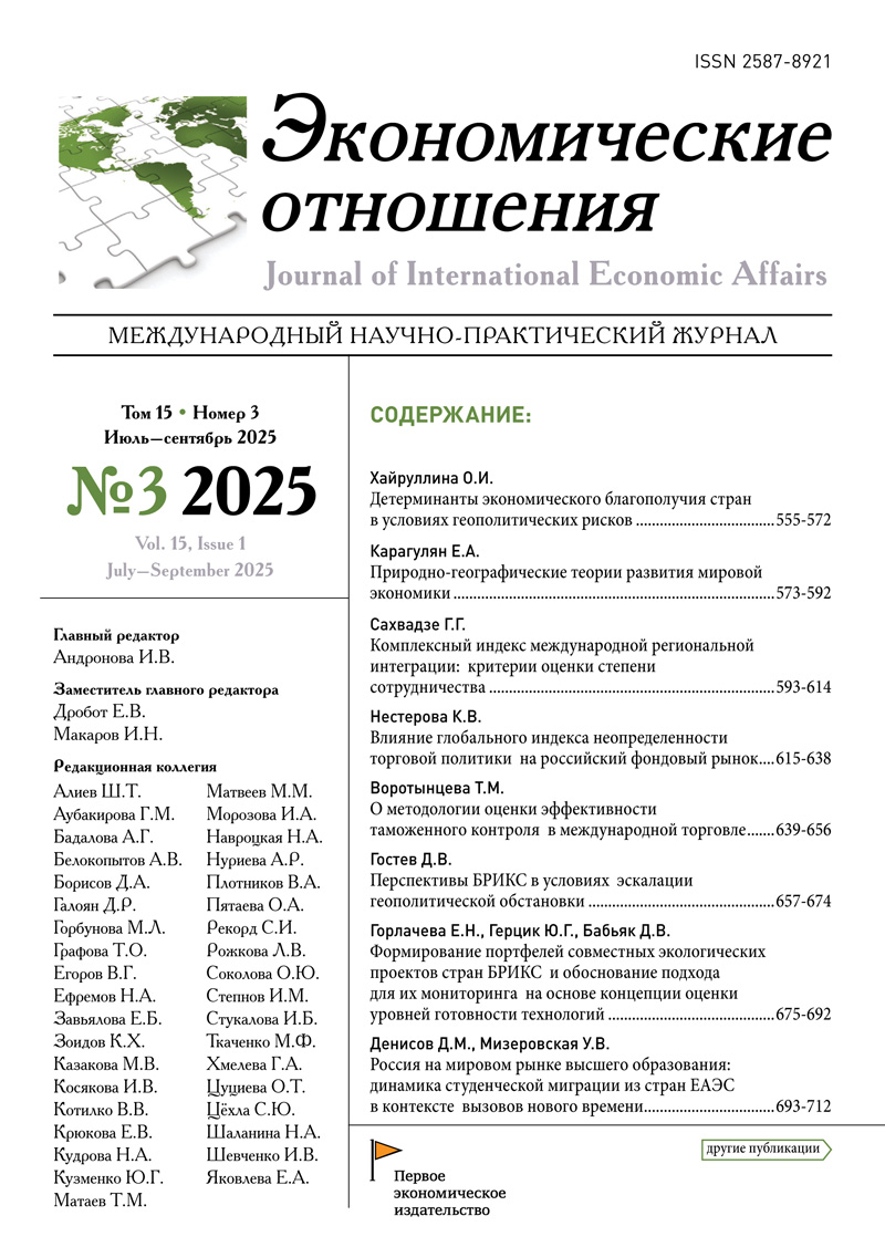Журнал ЭКОНОМИЧЕСКИЕ ОТНОШЕНИЯ посвящен исследованиям в области внешнеэкономической деятельности, экономической интеграции и глобализации. В журнале рассматриваются вопросы организации внешнеэкономических связей, логистики, экономики таможенного дела, проблемы конкурентоспособности и экономической безопасности, импортозамещения. Приоритетное внимание уделяется исследованиям в области развития и стимулирования внешнеэкономической деятельности в условиях международной экономической интеграции.В журнале публикуются статьи сотрудников научных и учебных заведений, аспирантов, докторантов и независимых исследователей.