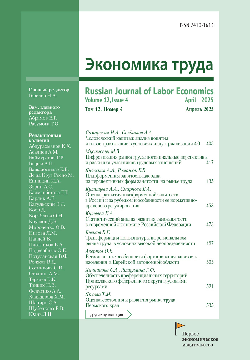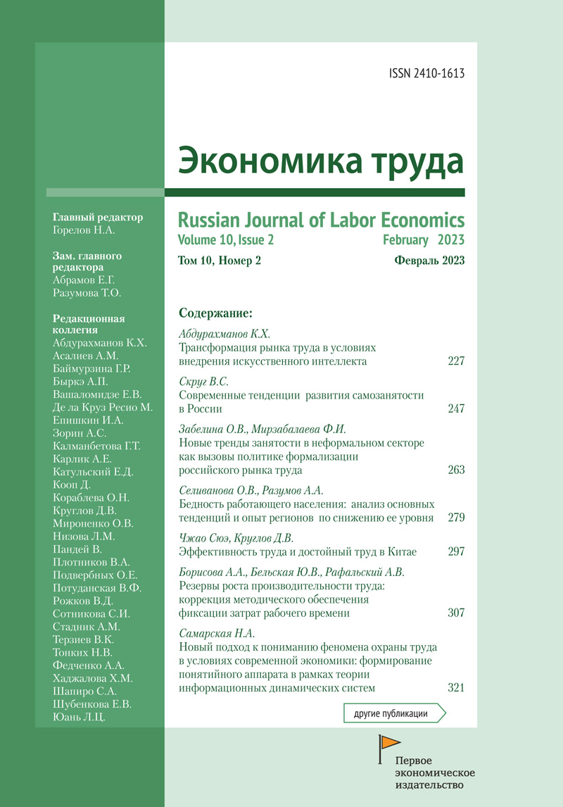 Экономика труда – международный научно-практический журнал, посвященный теоретико-методологическим и практическим аспектам трудовой деятельности, включая исследования рынка труда, социально-трудовых отношений, производительности и эффективности труда, вознаграждения работников, воспроизводства трудовых ресурсов, а также другим научным материалам в контексте паспорта специальности ВАК – Экономика труда.В журнале публикуются оригинальные результаты научных исследований в области экономики и организации труда в России и за рубежом, аналитические обзоры, рецензии, а также короткие сообщения о проводимых исследованиях и статистике труда по выбору редакции. Все публикуемые статьи проходят обязательное рецензирование.