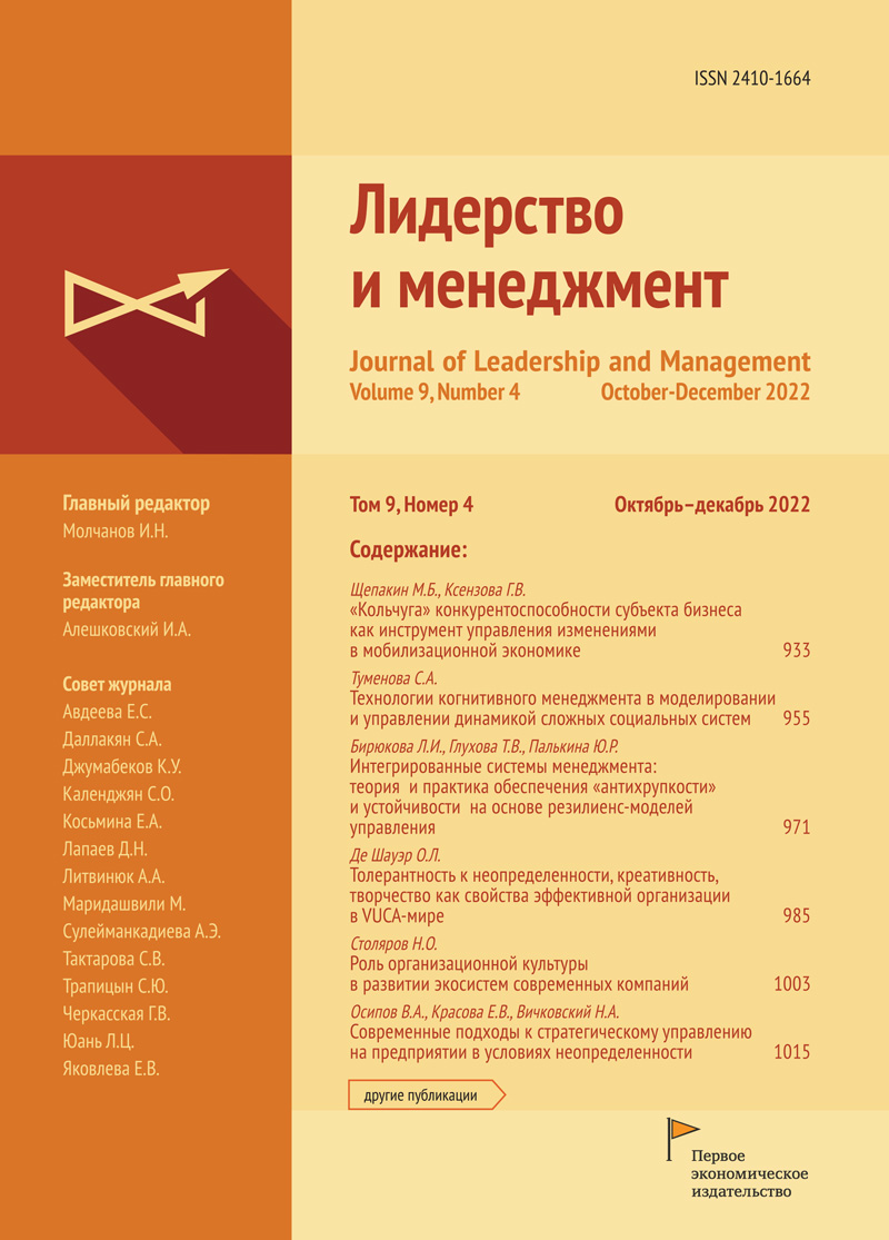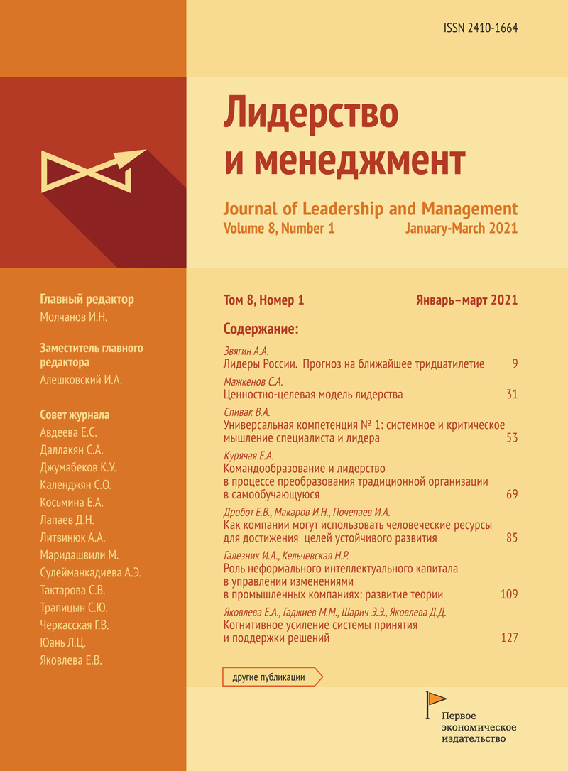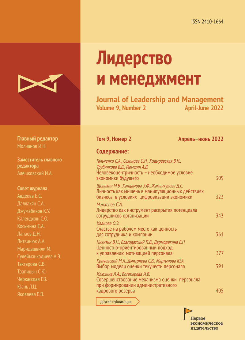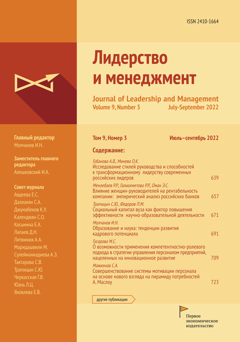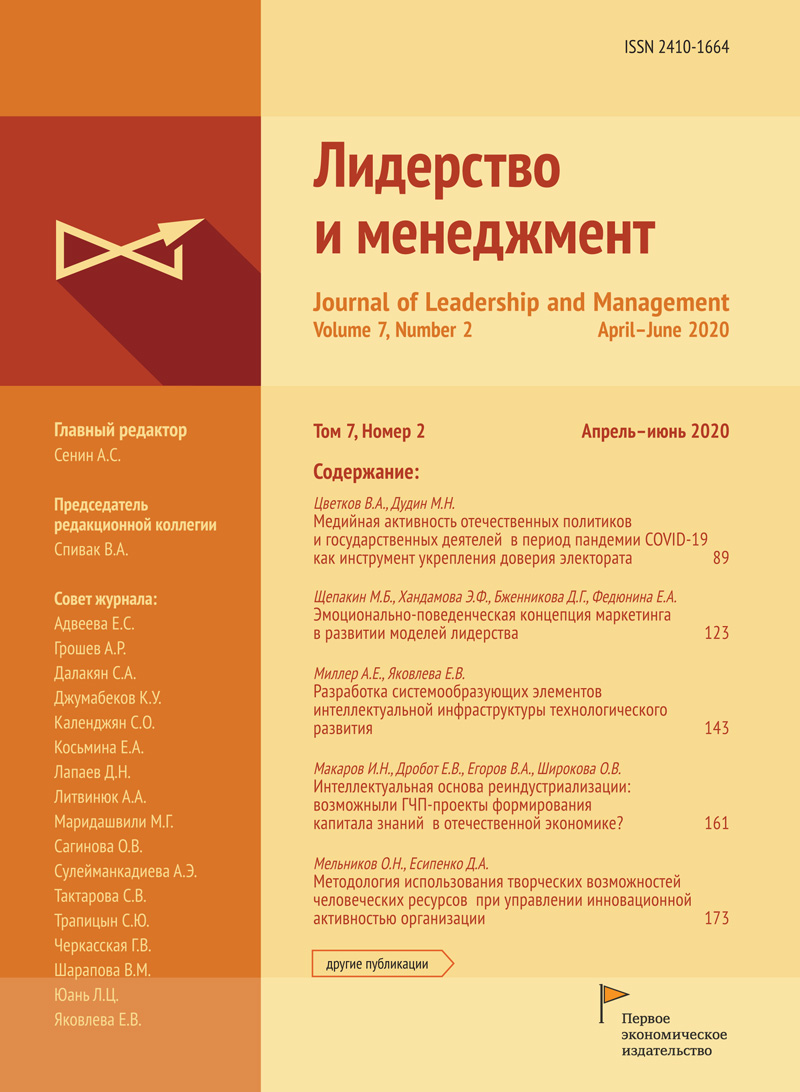 The goal of The Journal LEADERSHIP AND MANAGEMENT is to become an information and expert center in the field of studies on the problem of leadership and leader qualities in the system of organization management. The main themes of the journal are leadership studies as an independent scientific area and as a management instrument in corporal economy, leader’s personal qualities as well as psychological and social aspects of leadership.The journal mainly contains research results, reviews, analytical overviews, announcements of scientific and professional events, polemic materials and collections of publications in Russian and foreign periodicals.