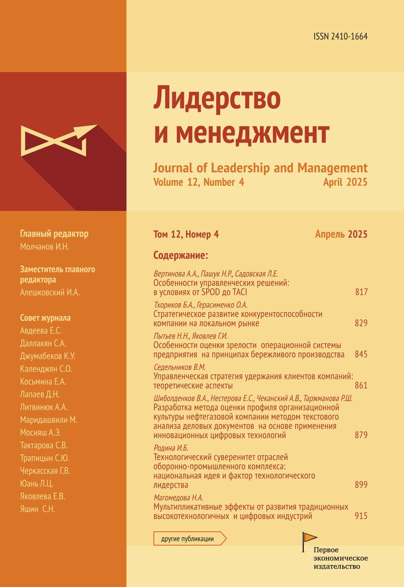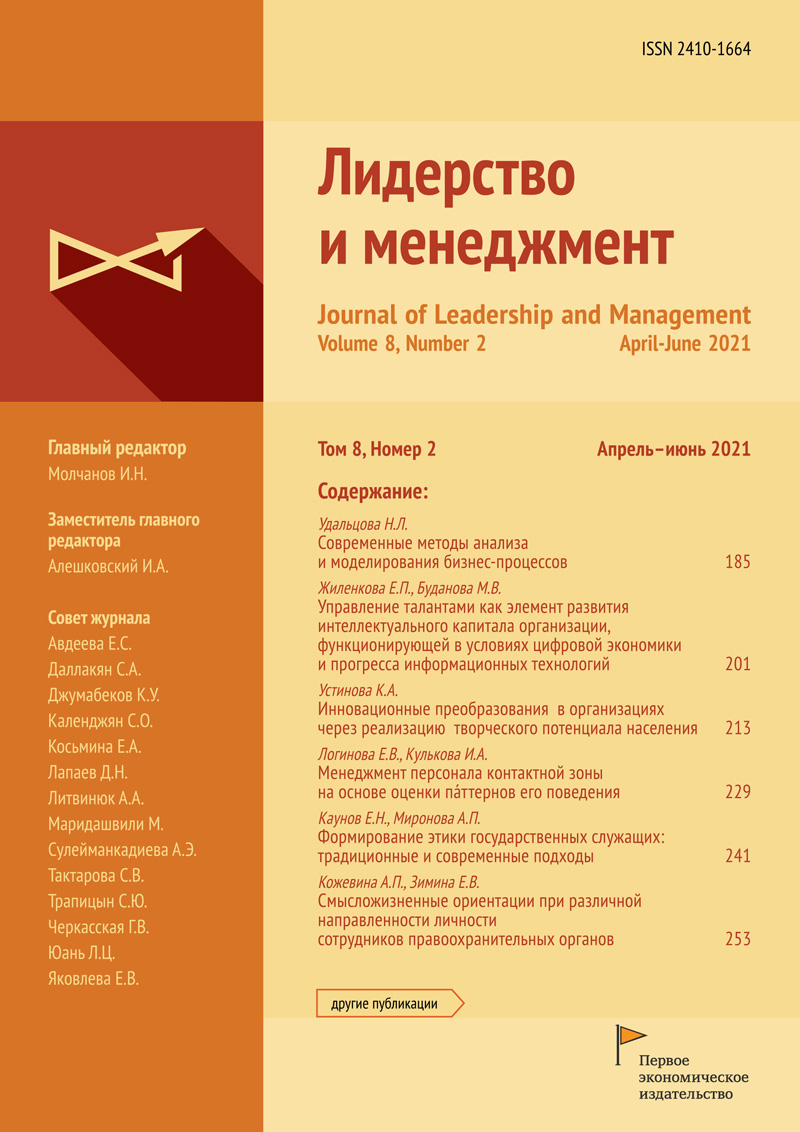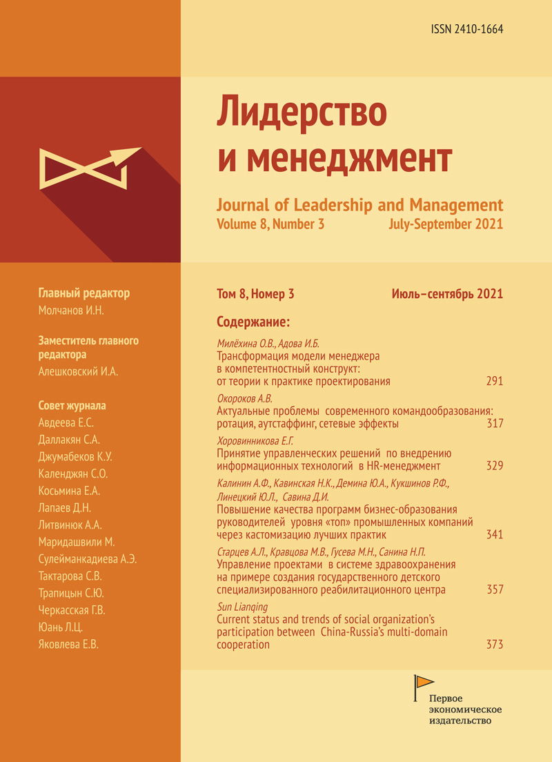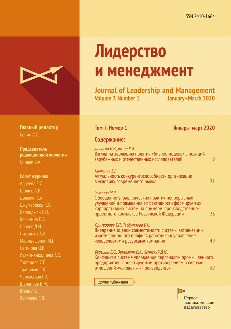 The goal of The Journal LEADERSHIP AND MANAGEMENT is to become an information and expert center in the field of studies on the problem of leadership and leader qualities in the system of organization management. The main themes of the journal are leadership studies as an independent scientific area and as a management instrument in corporal economy, leader’s personal qualities as well as psychological and social aspects of leadership.The journal mainly contains research results, reviews, analytical overviews, announcements of scientific and professional events, polemic materials and collections of publications in Russian and foreign periodicals.