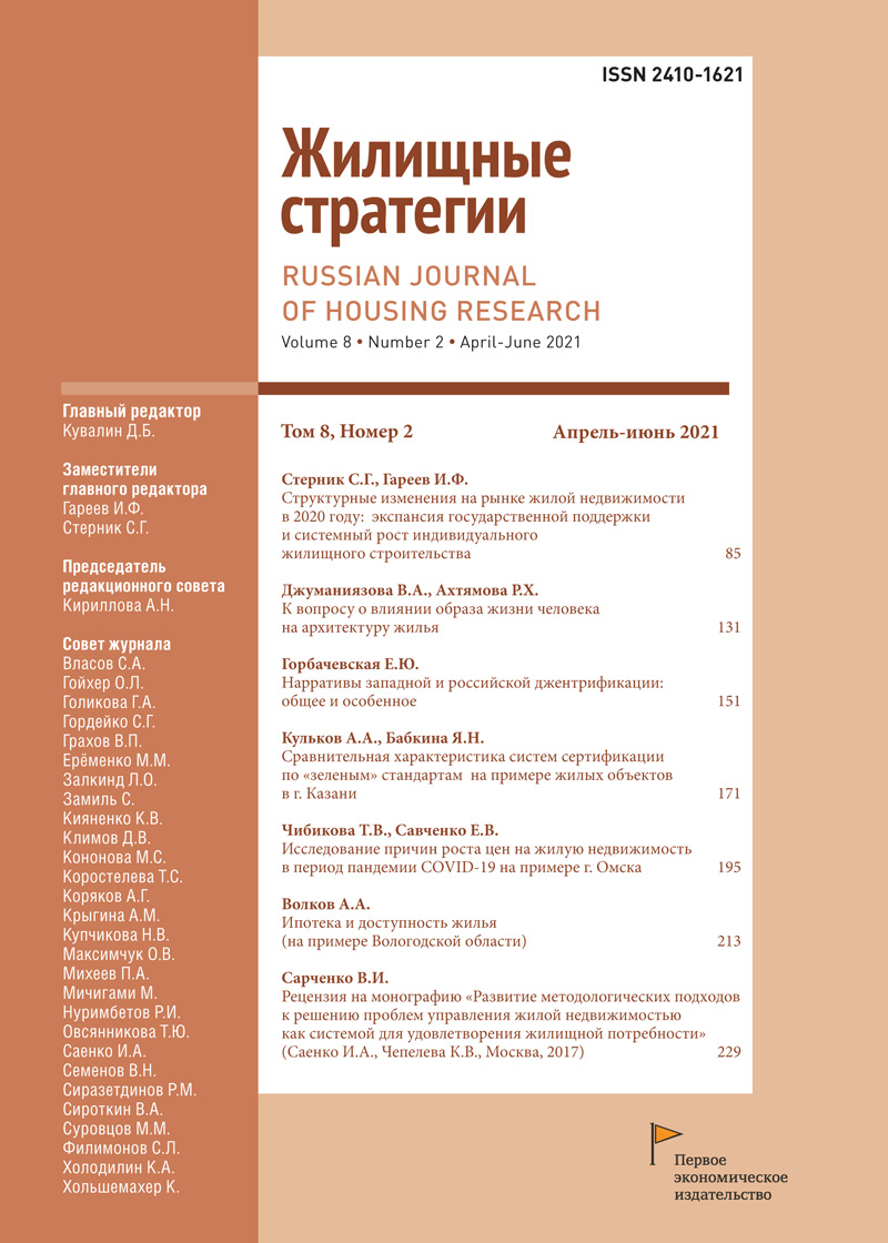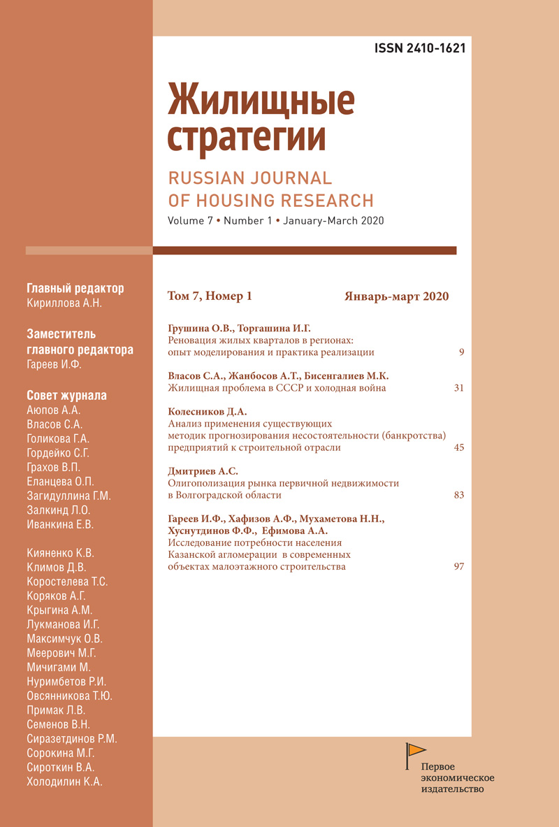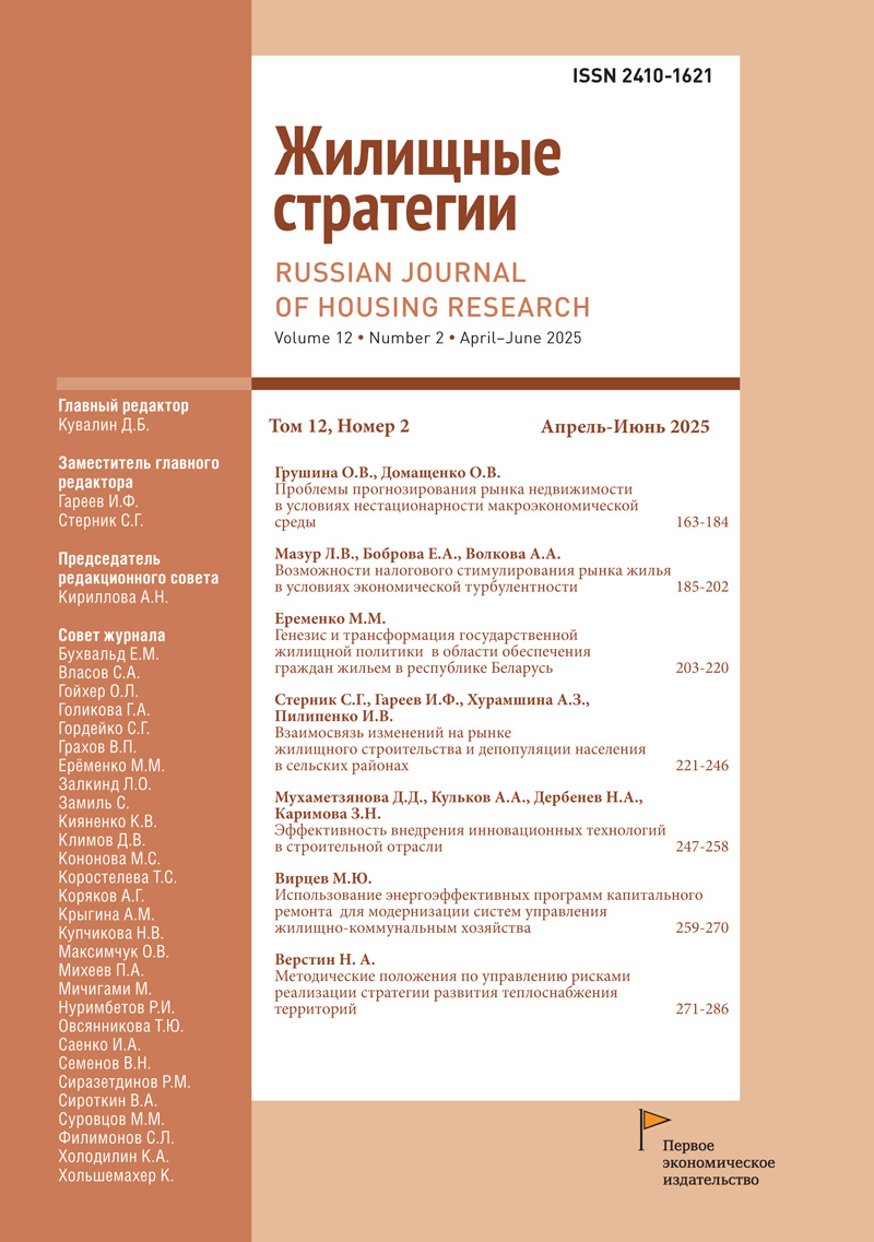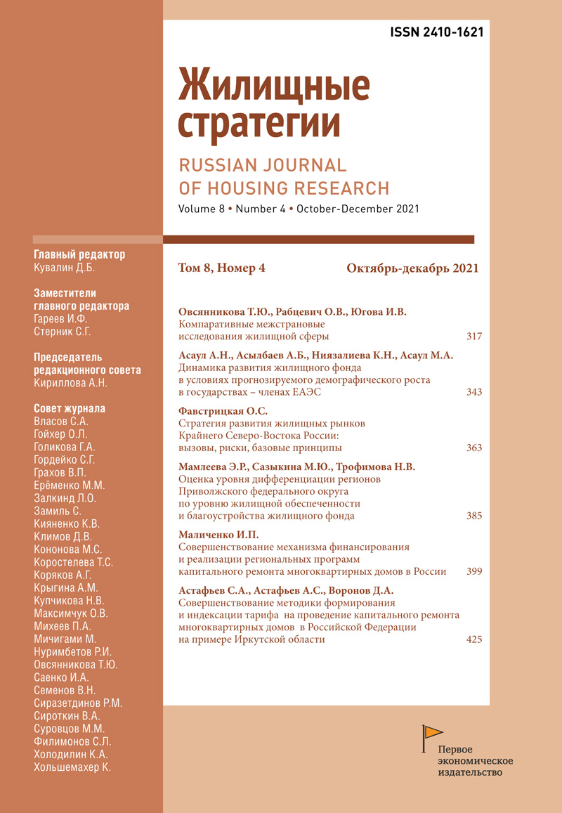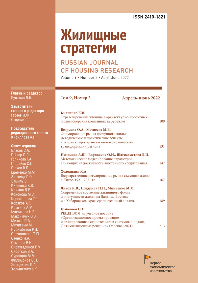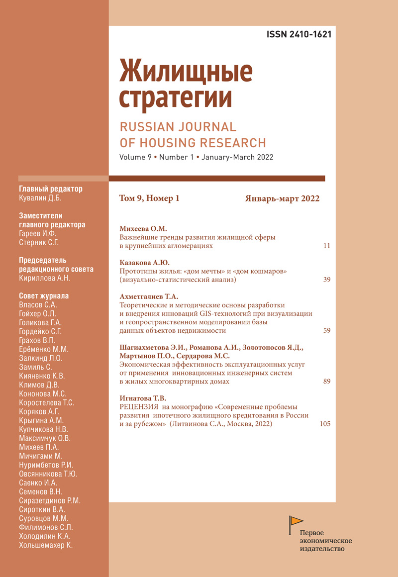 Журнал ЖИЛИЩНЫЕ СТРАТЕГИИ посвящен исследованиям в области формирования жилищной стратегии, обеспечивающей оптимальную структуру жилищного строительства и жилищного фонда, удовлетворяющей потребностям различных категорий граждан. В журнале публикуются обзорные и оригинальные статьи, содержащие результаты отечественных и зарубежных исследований и практической деятельности в области развития рынка жилой недвижимости и жилищного строительства. Рассматриваются актуальные вопросы государственного регулирования жилищной политики, механизмы государственно-частного партнерства, а также региональные особенности жилищной сферы.Главная цель журнала – ознакомление с результатами научных исследований в области решения жилищного вопроса и дальнейшее их обсуждение.
