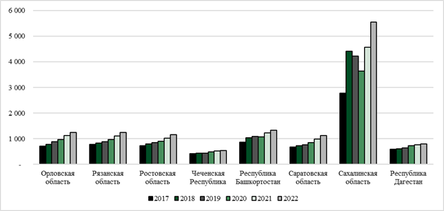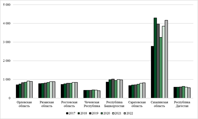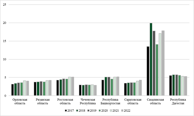 По уровням почасовой ПТ выделены три группы регионов: а) высокая ПТ: Сахалинская область, где среднее значение показателя за период с 2017 по 2022 гг. в ценах 2017 года составило 16,7 тыс. руб. на один отработанный человеко-час; б) средняя ПТ: Дагестан, Башкортостан, Ростовская, Рязанская, Саратовская и Орловская области, среднее значение показателя за период в которых составило 5,6, 4,9, 4,7, 3,9, 3,7 и 3,6 тыс. руб., соответственно; в) низкая ПТ обнаружена в Чечне (3,0 тыс. руб.).