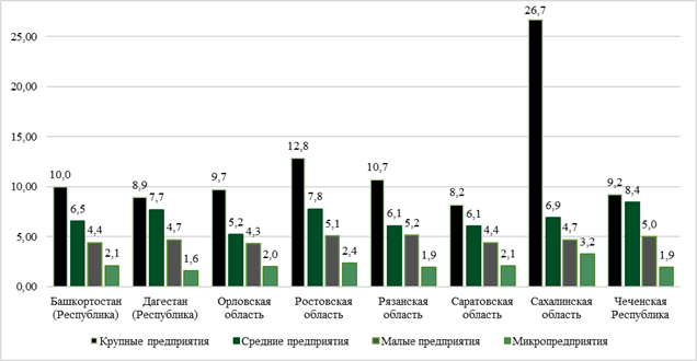 Проводимые авторами расчеты в соответствии с настоящим подходом основывались на базе данных федеральной службы государственной статистики в отношении информации о ВРП, инфляции, а также численности занятого населения в регионах России. По уровням ПТ выделены три группы регионов: а) высокая ПТ: Сахалинская область, где среднее значение показателя за период с 2017 по 2022 гг. в номинальном выражении составило 4,2 млн. руб.; б) средняя ПТ: Башкортостан, Рязанская, Орловская, Ростовская и Саратовская области, среднее значение показателя за период в которых составило от 1,1, до 0,9 млн. руб., соответственно; в) низкая ПТ: Дагестан (0,7 млн. руб.) и Чечня (0,5 млн. руб.). Графическое изображение представлено на рисунке 1.