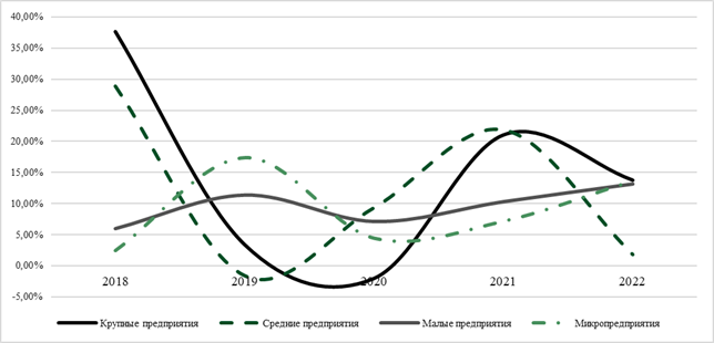Высокие показатели прироста ПТ крупных предприятий обрабатывающей промышленности и сельского хозяйства, в свою очередь, объясняются приоритетным характером данных отраслей в проводимой России экономической политике. Данное утверждение подтверждает рост внутренних затрат на научные исследования и разработки в сельском хозяйстве и промышленном производстве в период с 2010 по 2023 гг. на 260,4% и 270,5% в номинальном выражении соответственно [1]. Как отмечают отечественные исследователи, увеличение затрат на исследования и разработки приводят не только к увеличению эффективности государственной поддержки предприятий, но также способствуют ускоренному росту выручки предприятий [6]. Следовательно, указанное значительное увеличение затрат на исследования и разработки в сельском хозяйстве и промышленном производстве является одним из центральных факторов, способствовавших повышенным темпам роста ПТ за период с 2017 по 2022 гг.