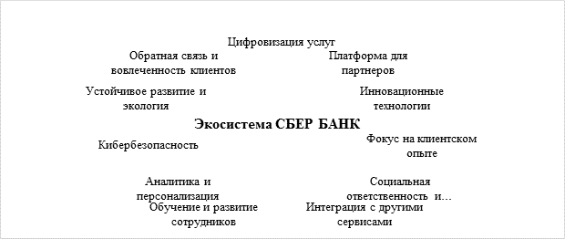 Представленная на рисунке 1 цифровая экосистема СБЕР БАНК содержит в себе следующие структурные элементы: цифровизация услуг, платформа для партнеров, инновационные технологии, фокус на клиентском опыте, социальная ответственность и устойчивое развитие, интеграция с другими сервисами, обучение и развитие сотрудников, аналитика и персонализация, кибербезопасность, устойчивое развитие и экология, обратная связь и вовлеченность клиентов.