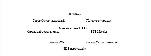 Структурными элементами цифровой экосистемы ВТБ выступают: ВТБ Банк, проект велопроката, ВТБ Мобайл, сервис экспорт менеджер, В2В маркетплейс, комиссиON, сервис цифровая ипотека, сервис МетрКвадратный.