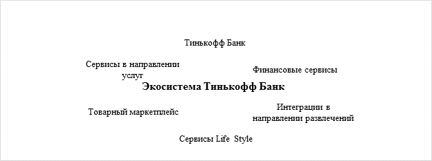 Экосистема Тинькофф Банк состоит из следующих структурных элементов: Тинькофф Банк, финансовые сервисы, интеграции в направлении развлечений, сервисы Life Style, товарный маркетплейс, сервисы в направлении услуг.