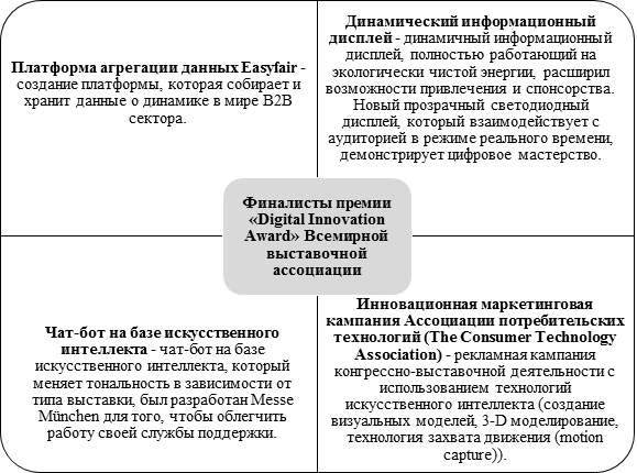 В качестве примера цифровизации конгрессно-выставочной индустрии стоит обозначить 4 работы, которые были отмечены наградами Всемирной выставочной ассоциации как финалисты премии «Премия за цифровые инновации» («Digital Innovation Award»). Содержание работ финалистов представлено на рисунке 3.