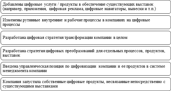 На основании изложенного материала можно определить следующие направления цифровой трансформации конгрессно-выставочной индустрии: совершенствование материально-технической базы конгрессно-выставочной индустрии; повышение уровня цифровизации выставочного маркетинга; развитие профессиональной подготовки и переподготовки кадров для работы в сфере выставочной индустрии; создание цифровой экосистемы конгрессно-выставочной индустрии (включает в себя предыдущие уровни).