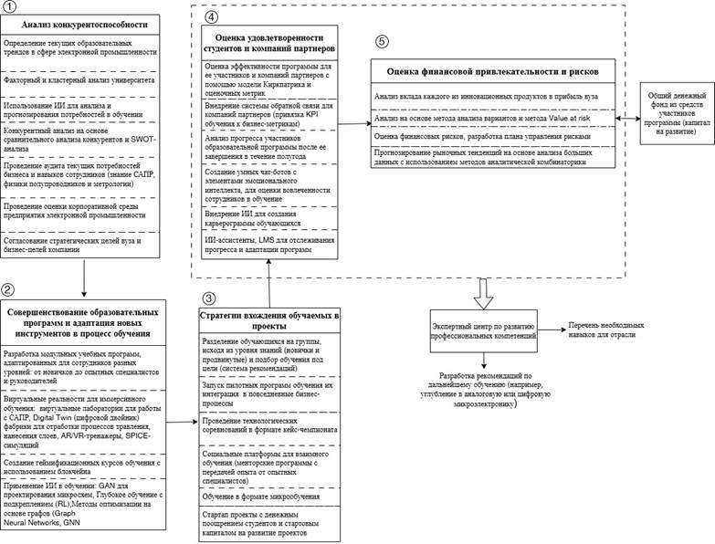 В модель включены такие образовательные инструменты, как иммерсивное обучение, геймификационные курсы, ИИ с возможностью создания карьерограммы обучающихся (для будущей оценки компаний-партнеров, о том, каких именно специалистов не хватает, какого возраста и квалификации), социальные платформы для взаимного обучения. Специалисты после обучения смогут использовать GAN для проектирования микросхем, нейросетевые методы для анализа дефектов (Computer Vision + CNN), а также будут обучаться на стимуляторах, что значительно сократит количество технологических ошибок и финансовые риски.