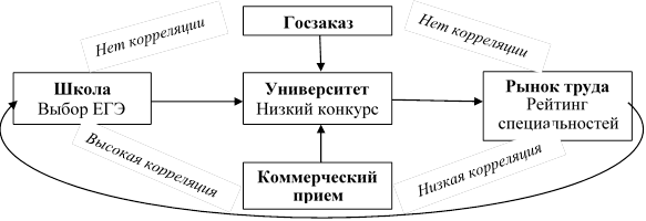 Так, в школах выбор ЕГЭ осуществляется без учета востребованности будущей специальности. Нет корреляции между выбором абитуриентов и госзаказом на специальности. Отсутствует соответствие между госзаказом и потребностями рынка труда. Коммерческие вузы оказывают сглаживающий эффект, но приводят к значительному снижению конкуренции в вузах. И самое главное – нет кадрового планирования и прогнозирования с обратной связью.
