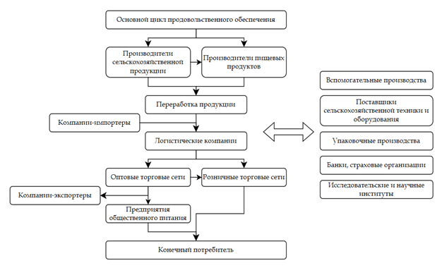 Во многом продовольственная безопасность напрямую связана с процессами развития АПК, а государственные программы направлены на поддержание его роста. При этом, система продовольственного обеспечения представляется более сложной структурой, включающей государственные институты, частный бизнес, домохозяйства и процессы различных взаимодействий между ними. На рисунке 1 предложена концептуальная модель структуры системы продовольственного обеспечения, являющаяся объектом обеспечения продовольственной безопасности.