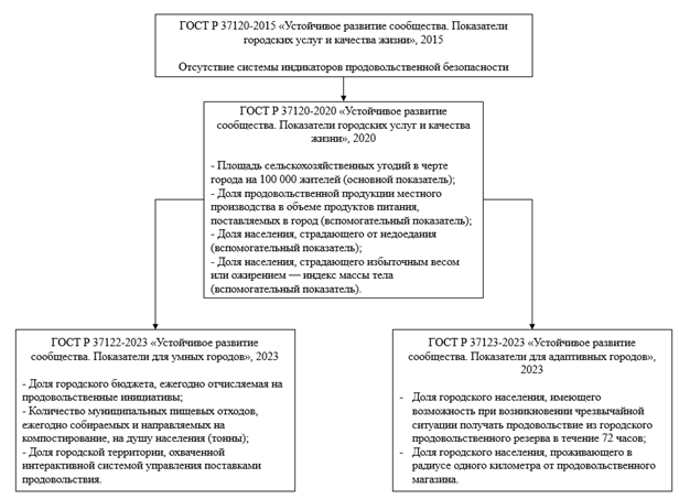 На фоне увеличения интереса к функционированию городских систем активно разрабатываются концепции «умных» и «адаптивных» городов. В контексте продовольственной безопасности, по мнению автора, особый интерес представляют критерии адаптивности города. Под адаптивностью города понимается способность города к подготовке, восстановлению и адаптации к потрясениям, перегрузкам и шокам [7]. При этом, если раньше вопросы адаптивности в контексте продовольственной безопасности не рассматривались, то сейчас, с учетом возникновения экономических и неэкономических шоков, в том числе оказывающих высокое влияние на городское население, данная концепция имеет высокую актуальность. На рисунке 2 приведены, предлагаемые ИСО (Международная организация по стандартизации) и внедренные в России, индикаторы оценки продовольственной безопасности городов.