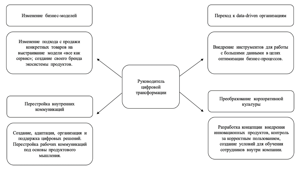 Подобное разнообразие объясняется спецификой бизнеса, основными задачами, с которыми организация сталкивается ежедневно, а также ключевых потребностей в выстраивании бизнес-стратегии. Таким образом, менеджер цифровой трансформации должен обладать широким спектром навыков, понимать суть поставленных задач, знать основные направления работы в подразделениях, обладать коммуникативными навыками и уметь грамотно выстраивать бизнес-процессы [7].