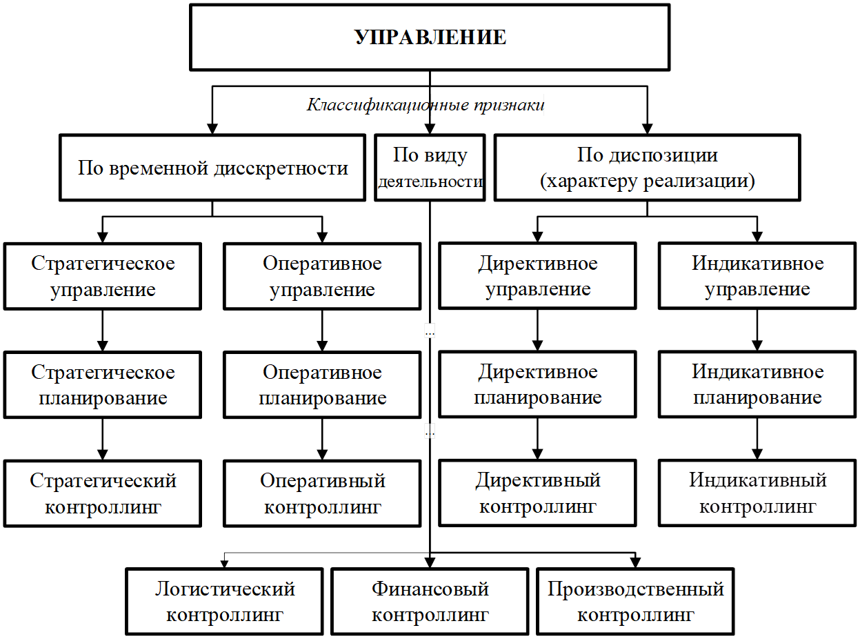 Согласно первой классификации разделяют стратегическое и оперативное управление, во второй выделяют управление определенным видом деятельности, а в третьей различают директивное и индикативное управление. Каждому из приведенных видов управления соответствует одноименный вид планирования и контроля.