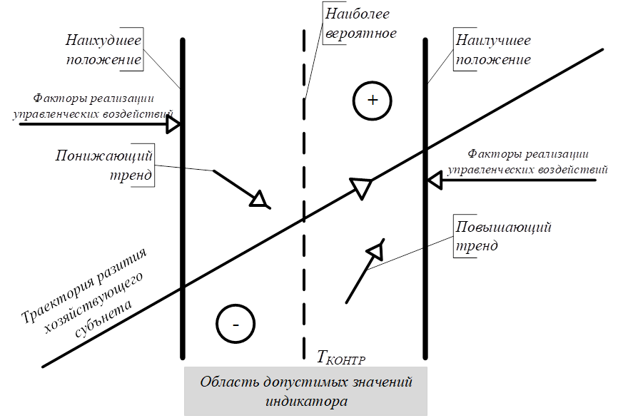 Индикаторы взаимосвязаны, объединены в систему и адаптивны, т. е. могут корректироваться в процессе управления. Они имеют граничные значения, которые характеризуют определенные ситуации и соответствующие им варианты поведения хозяйствующего субъекта (сценарии). В этой связи можно выделить три характерных положения хозяйствующего субъекта в контрольной точке: