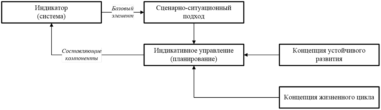Таким образом индикаторы, их система являются базовыми элементами сценарно-ситуационного подхода, который в свою очередь в комплексе с концепциями устойчивого развития и жизненного цикла определяет сущность индикативного управления и соответствующего ему индикативного планирования (рис 3).