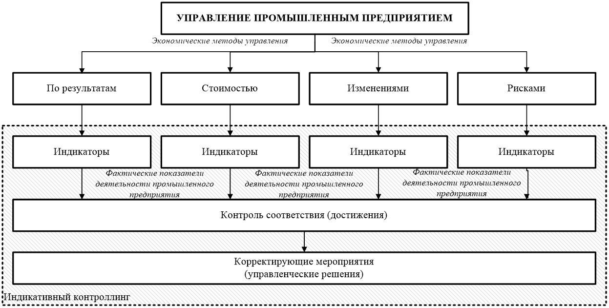 В рамках интегрального механизма индикативного контроллинга при реализации указанных выше экономических методов управления происходит сопоставление фактических показателей деятельности промышленного предприятия с индикаторами, т. е. осуществляется функция контроля.