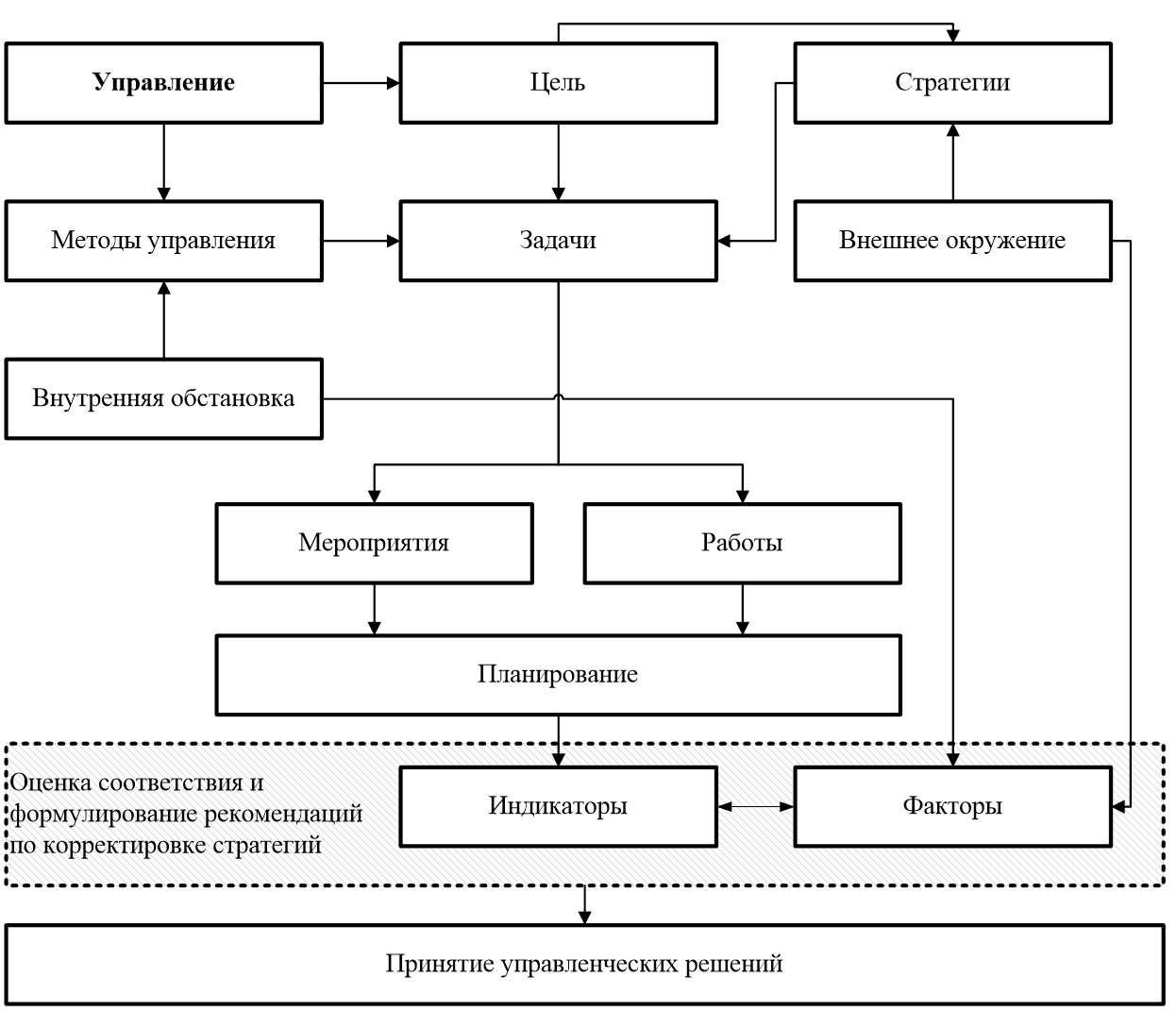 В соответствии с основополагающими постулатами менеджмента отправной точкой управления служит целеполагание. Под воздействием окружающей внешней среды верифицируются пути достижения обозначенной цели, которая декомпозируется на подцели, затем идентифицирующиеся как задачи. Исходя из внутренней обстановки субъектом воздействия подбираются наиболее эффективные инструменты (методы) управления, позволяющие соответствующим образом решить поставленные задачи и предполагающие процессный подход. Для чего выделяются мероприятия, работы и контрольные события, а также устанавливаются между ними связи. Описанные процедуры относятся к функциональному блоку планирования, в рамках которого, собственно, и обозначается индикативный характер всей системы управления. На данном этапе формируются индикаторы, а также определяются факторы, оказывающие на них значительное воздействие. Вследствие чего создается возможность вариации управленческих решений и применения сценарно-ситуационного подхода [17, с. 371-377].