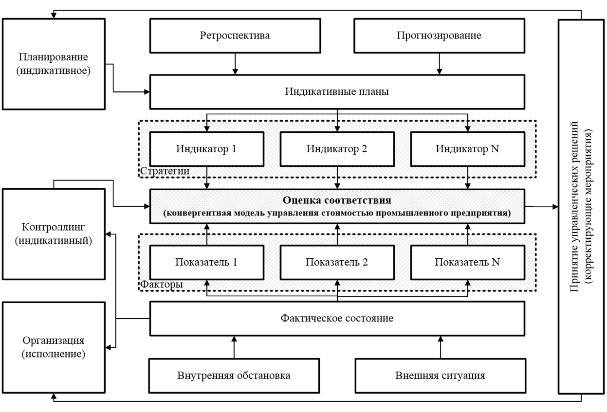 Одним из стратегически важных направлений экономической политики Российской Федерации является повышение капитализации российской экономики. В настоящей работе авторами предлагается организационно-экономический механизм индикативного контроллинга, реализация которого в системе управления промышленным предприятием позволяет добиться повышения эффективности принимаемых управленческих решений, роста конкурентоспособности, прибыли, и как следствие, повышения стоимости российских промышленных предприятий. В результате проведения исследования были получены следующие результаты: проведен анализ современных подходов к управлению компанией и представлена их авторская классификация, дана авторская трактовка категории «индикативный контроллинг», предложен организационно-экономический механизм индикативного контроллинга и описан механизм его реализации в системе управления промышленным предприятием, представлена схема реализации конвергентной модели управления стоимостью компании, основывающейся на применении сценарно-ситуационного подхода, описана схема формирования экономического эффекта при реализации индикативного контроллинга. Статья будет интересна управленцам среднего и высшего звена, а также исследователям, занимающимся вопросами повышения экономической эффективности системы управления промышленным предприятием и роста капитализации экономики.