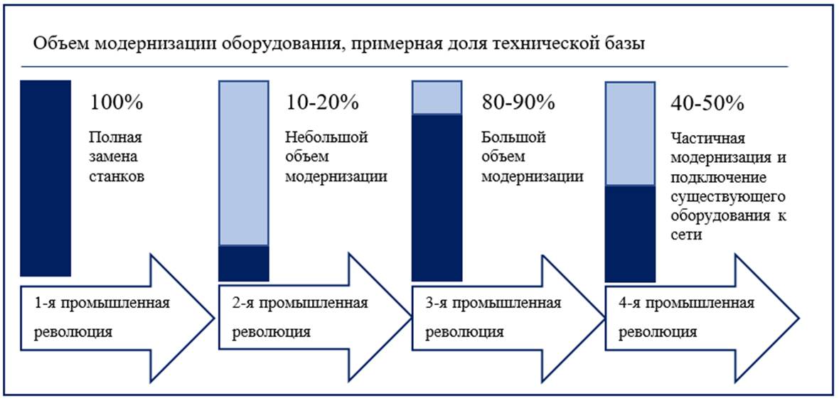 Промышленные революции, начавшиеся во второй половине XVIII века, «стали вехами на пути от использования мышечной силы к механической энергии, который привел к сегодняшнему историческому моменту, когда в процессе четвертой промышленной революции производство развивается за счет познавательной деятельности человека» [9, c.11].
