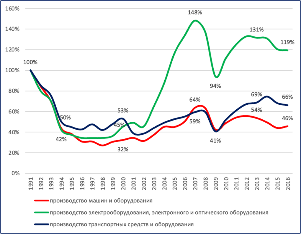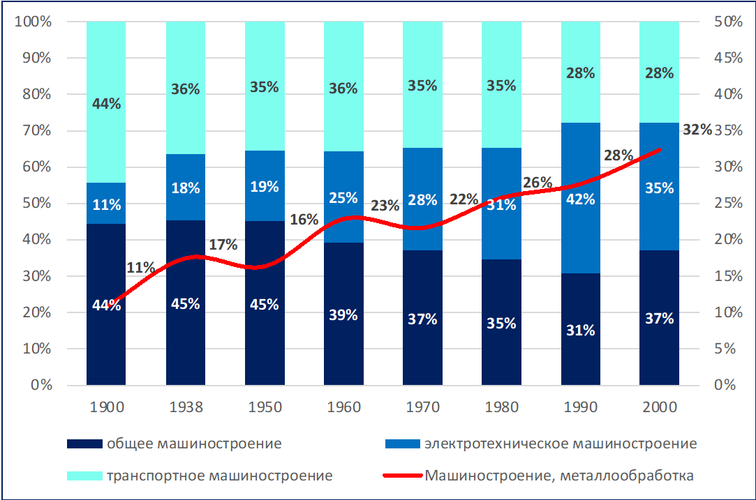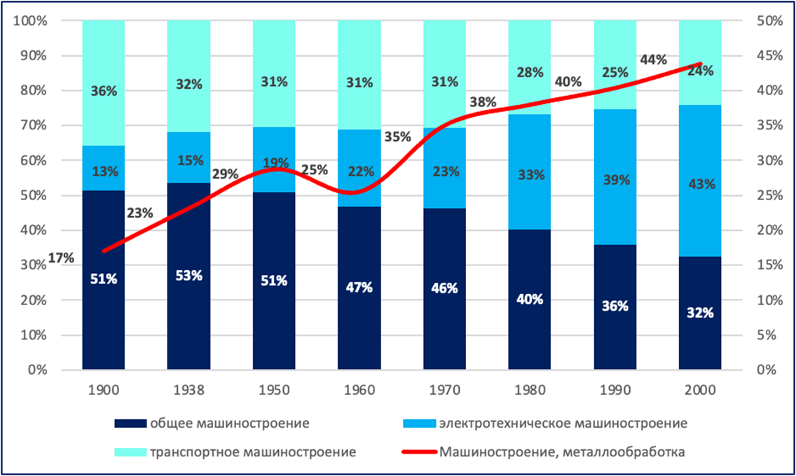 Так, на начало ХХ века основную часть машиностроения составляло производство технологического оборудования для различных отраслей промышленности и изготовление актуальных для того времени транспортных средств. Важнейшей тенденцией ХХ столетия стало усиление роли электротехнического машиностроения, занявшего к концу века доминантное положение в общей структуре. При этом, с 1970-х годов начинает ускоренно наращиваться зародившееся в электротехническом машиностроении направление, связанное с производство электроники, компьютеров и средств для телекоммуникаций (см.рис.3).