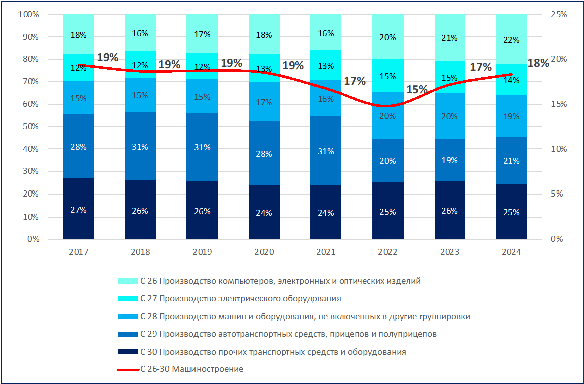 Таким образом, отраслевая структура машиностроения в значительной степени определяется ходом научно-технического прогресса. В тоже время, справедливости ради, необходимо отметить, что текущие реалии развития отечественного машиностроения сформированы не только технологическими тенденциями, но также изменениями условий внешней торговли, ростом потребления машиностроительной продукции специального назначения в условиях проведения СВО, принятием и началом реализации масштабных мер по достижению технологической независимости [32, c.66].