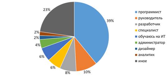Большая часть респондентов работает в найме (53,5%) или обучается (38,9%), а 6,6% участников анкетирования – предприниматели. Профессиональная структура респондентов выглядит следующим образом (рис. 1): большинство являются программистами (39%), далее следуют руководители (10%) и разработчики (8%). Лишь 6% участников указали, что обучаются. Это объясняется тем, что обучающиеся сразу отмечали свое направление подготовки, так как имеют практику и опыт работы в нём (например, программист, разработчик и т.д.).