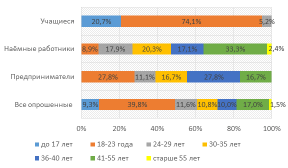 Большинство респондентов – это мужчины (71%), в том числе среди предпринимателей их 88,9%, среди учащихся – 76,7%, среди работающих в найме – 64,2%. Возраст опрошенных различен (рис. 2). Большая часть – от 18 до 23 лет (39,8%). Объединённый сегмент от 24 до 55 лет составляет вторую большую группу (49,4%). Среди предпринимателей большинство в возрасте с 36 до 40 лет (27,8%), среди наёмных работников – с 41 до 55 лет (33,3%), а среди учащихся – студенты (74,1%).