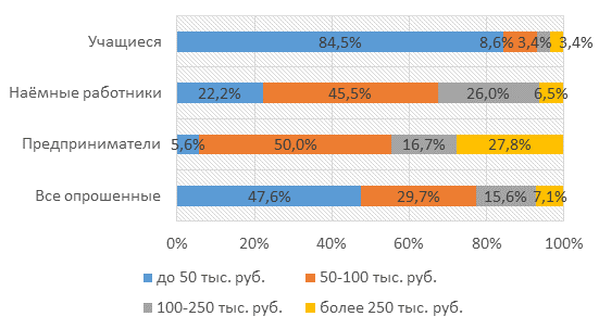 Свой ежемесячный уровень дохода большинство респондентов оценивают ниже 50 тысяч рублей. При этом 7,1% оценивают его выше 250 тысяч рублей в месяц (рис. 3).