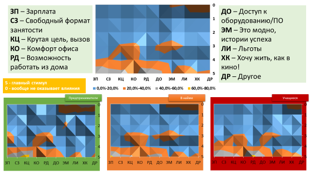 При этом у предпринимателей большинство выбирает стимулом именно цель (72%), у работников в найме – заработную плату (65%), у учащихся – возможность работать из дома (66%). Это служит подтверждением потенциала нематериального стимулирования кадров, как альтернативы консервативному подходу применения исключительно финансового стимулирования. Причем важно понимать особенности непосредственно той целевой аудитории, под которую подбираются нематериальные стимулы, так как их эффективность очевидно зависит от разных факторов: от типа трудовой мотивации [2], от поколения и возраста [5] и т.д.