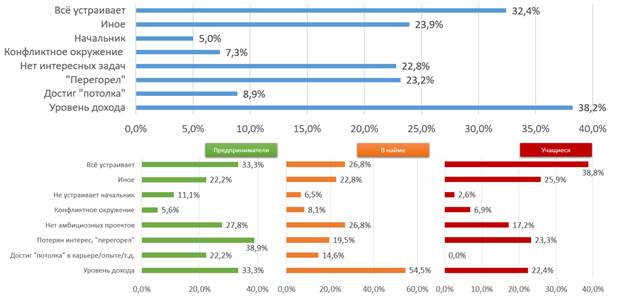 Важным фактором, ограничивающим эффективность внешнего стимулирования, является текущая жизненная проблематика. Так, среди респондентов на дату проведения анкетирования наибольшее беспокойство вызывал текущий уровень дохода (38,2% респондентов). Также отмечены отсутствие интересных задач и амбициозных проектов (22,8%), «перегорание» (23,2%) и иные проблемы. То есть помимо финансовой проблемы имеют место и нематериальные аспекты, негативно сказывающиеся на жизни граждан. При этом треть опрашиваемых всё устраивает (рис. 5).