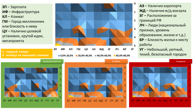 Среди важнейших мер способных простимулировать к переезду в другой город респондентами выделены: заработная плата (90% опрошенных поставили балльные значения 4 и 5), близость жилья к месту работы (72,2%), инфраструктура (70,3%), климат (66,3%), наличие аэропорта (64,5%), наличие целевой установки, крутой идеи, мегапроекта (62,5%), а также безопасность и уют маленького города (61,4%). Предприниматели также высоко оценили важность окружения (людей с определённым уровнем образования, жизни и т.д.) и негативно отреагировали на фактор расположения такого города за границей (61,1% поставили минимальный балл). Схожая оценка важности факторов и у остальных групп респондентов (рис. 6).