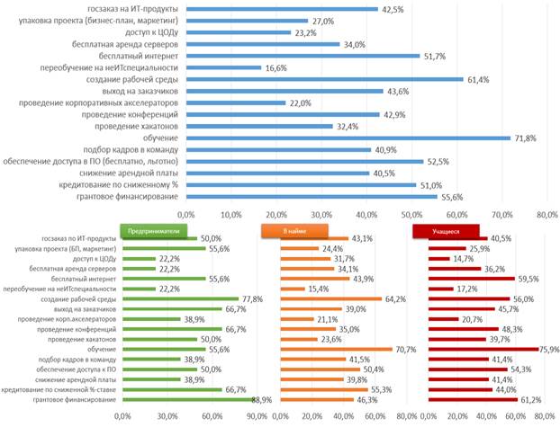 Трудовая деятельность является важной частью жизни людей. Поэтому поддержка работодателей (будь то стартап или крупная компания) также имеет весомое значение. Так, среди мер поддержки развития ИТ-предприятий, по общему мнению респондентов, наиболее востребованы: обучение сотрудников (71,8%), создание рабочей среды, в том числе комфортной обстановки в коллективе (61,4%), а также льготы и гранты (более 50%). При этом льготы на аренду помещений не так востребованы, как льготы на доступ к программному обеспечению. Это подтверждает специфику ИТ-проектов, успешная реализация которых возможна и удалённо. Относительно целевых групп можно отметить следующее: для предпринимателей наиболее важным является грантовое финансирование (88,9%), которое позволяет разработчикам сосредоточиться на ИТ-разработке, а не тратить временные ресурсы на поиск и привлечение инвестиций в проект. Но в большей степени гранты снижают риски на первичном этапе реализации проекта, когда слишком высока неопределённость результата. Сформировавшаяся грантовая система в большинстве случаев позволяет произвести продукт, не выводя его на рынок, а в случае с привлечением инвестиций – без реализации никак. На втором месте (как и в случае с наёмными работниками) находится создание рабочей среды – важный фактор, несомненно влияющий на успешность реализации проекта. Наиважнейшей же мерой для наёмных работников (как и для обучающихся) является обучение (70,7% и 75,9%, соответственно), что видимо обусловлено недостаточностью компетенций и/или неуверенностью в их актуальности для работы в сфере ИТ (рис. 7).