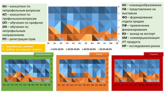 При оценке значимости сервисных услуг по пятибалльной шкале (рис. 8) более половины респондентов отметили в качестве максимально значимых услуги по привлечению финансирования (58,7%), обучению по профилю (57,1%) и коммерциализации ИТ-продукта (52,1%). При этом предприниматели, изначально ориентированные на извлечение прибыли и рыночную реализацию проекта, на первое место ставят именно коммерциализацию (максимально значимо для 66,7% респондентов), наёмные работники – привлечение финансирования (60,2%), учащиеся – обучение по профилю (62,9%). Это в большей степени свидетельствует о слабых местах каждой целевой группы, когда максимальное значение отдаётся наиболее значимой услуге, но с учётом (поправкой) на невозможность её реализации своими силами.