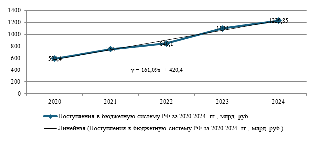 На рисунке 1 отображён анализ объёма поступлений в бюджетную систему страны в период 2020-2024 годы.