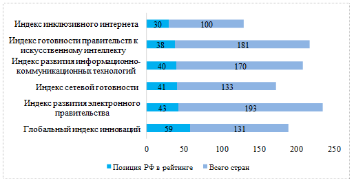 В настоящее время Российская Федерация занимает достаточно высокие позиции в международных рейтингах цифрового развития. В 2024 году Российская Федерация в рейтинге стран по индексу инклюзивного интернета заняла 30-е место из 100, индексу готовности правительств к искусственному интеллекту – 38-е место из 181, индексу развития информационно-коммуникационных технологий – 40-е место из 170, индексу сетевой готовности – 41-е место из 133, индексу развития электронного правительства – 43-е место из 193, глобальному индексу инноваций – 59-е место из 131 (рис.1).