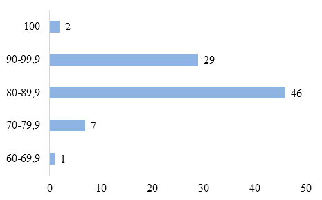 По итогам IV квартала 2024 г. показатель «цифровая зрелость органов государственной власти субъектов РФ, органов местного самоуправления и организаций в сфере здравоохранения, образования, городского хозяйства и строительства, общественного транспорта, подразумевающая использование ими отечественных информационно-технологических решений» в двух субъектах РФ достиг 100% (Москва, Белгородская область), в 29 регионах составил свыше 90% (рис.2). В 46 субъектах РФ значения индикатора «цифровая зрелость» находились в диапазоне от 80 % до 89,9 %. Самый низкий показатель «цифровой зрелости» у Северной Осетии (64%).