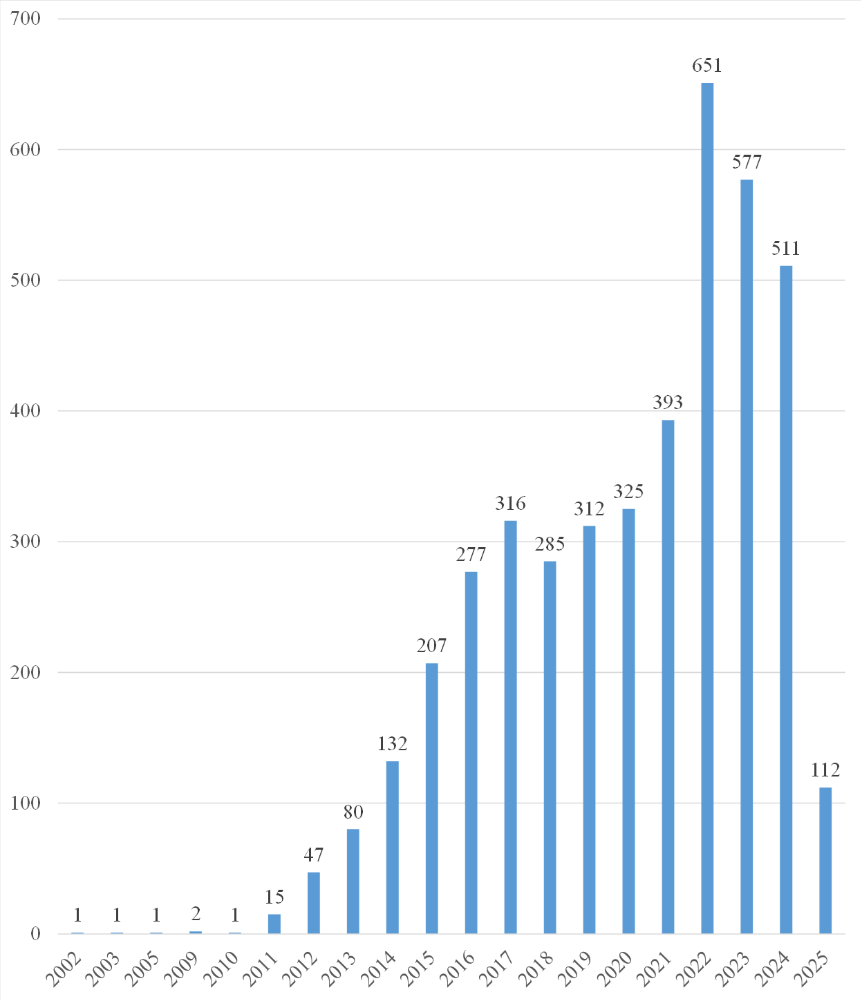 Первая публикация, в которой термин «зеленая экономика» стоит в названии, датируется 2002 г. (рис. 1). Наибольшее число публикаций, в названии которых содержится термин «зеленая экономика», приходится на 2022 г. (651), 2023 г. (577) и 2024 г. (511).