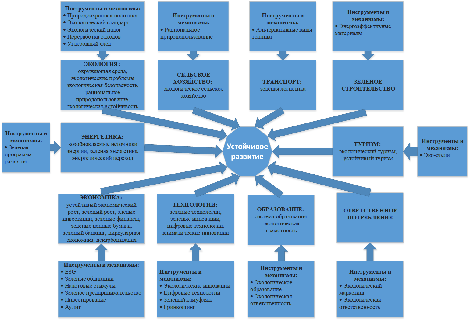 В 2015 г. Генеральной Ассамблеей ООН была утверждена «Повестка дня в области устойчивого развития на период до 2030 года», в которую вошли 17 целей в области устойчивого развития. В этих целях признается, что искоренение бедности и нищеты во всем мире должно сопровождаться стратегиями, направленными на обеспечение экономического роста, а также на удовлетворение целого ряда различных социальных потребностей населения, включая образование, здравоохранение, социальную защиту и создание рабочих мест, при одновременном предотвращении загрязнения окружающей среды и изменений климата. Таким образом, цели устойчивого развития устанавливают непосредственную взаимосвязь между экологической и экономической системами [58]. Также эти цели указывают на необходимость перехода к зеленой экономике, т.е. фундаментальной трансформации в сторону более устойчивых способов производства и потребления.