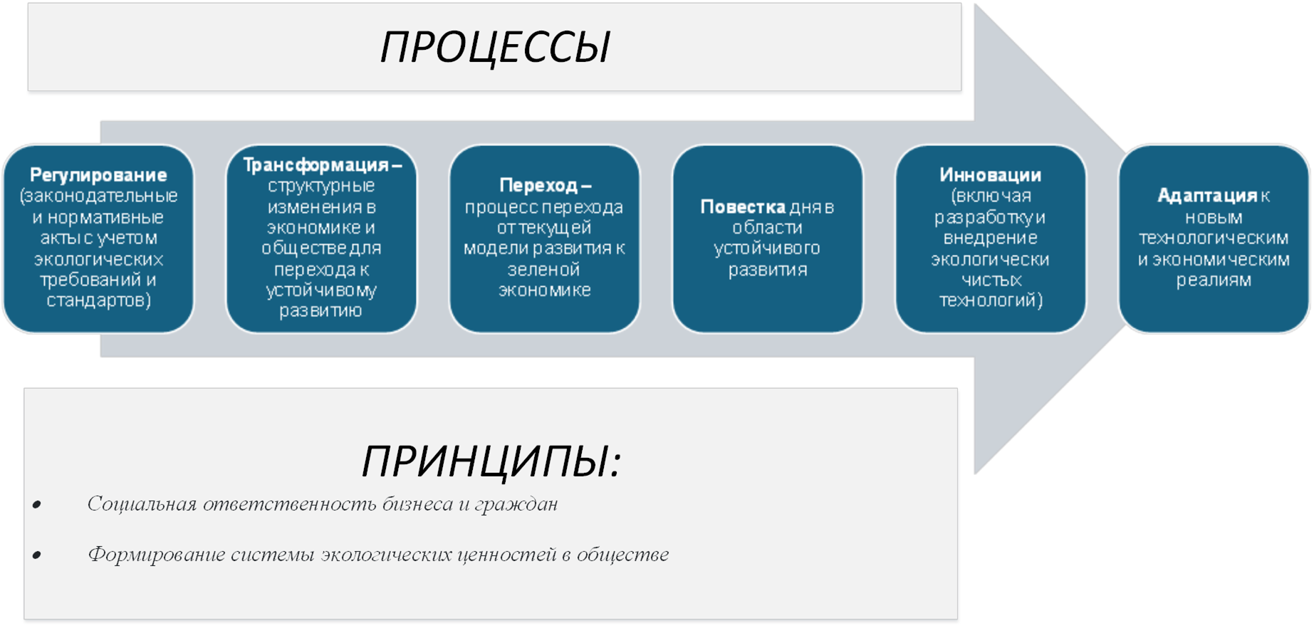 Рисунок 3. Процессы и принципы регулирования зеленой экономики в целях обеспечения устойчивого развития