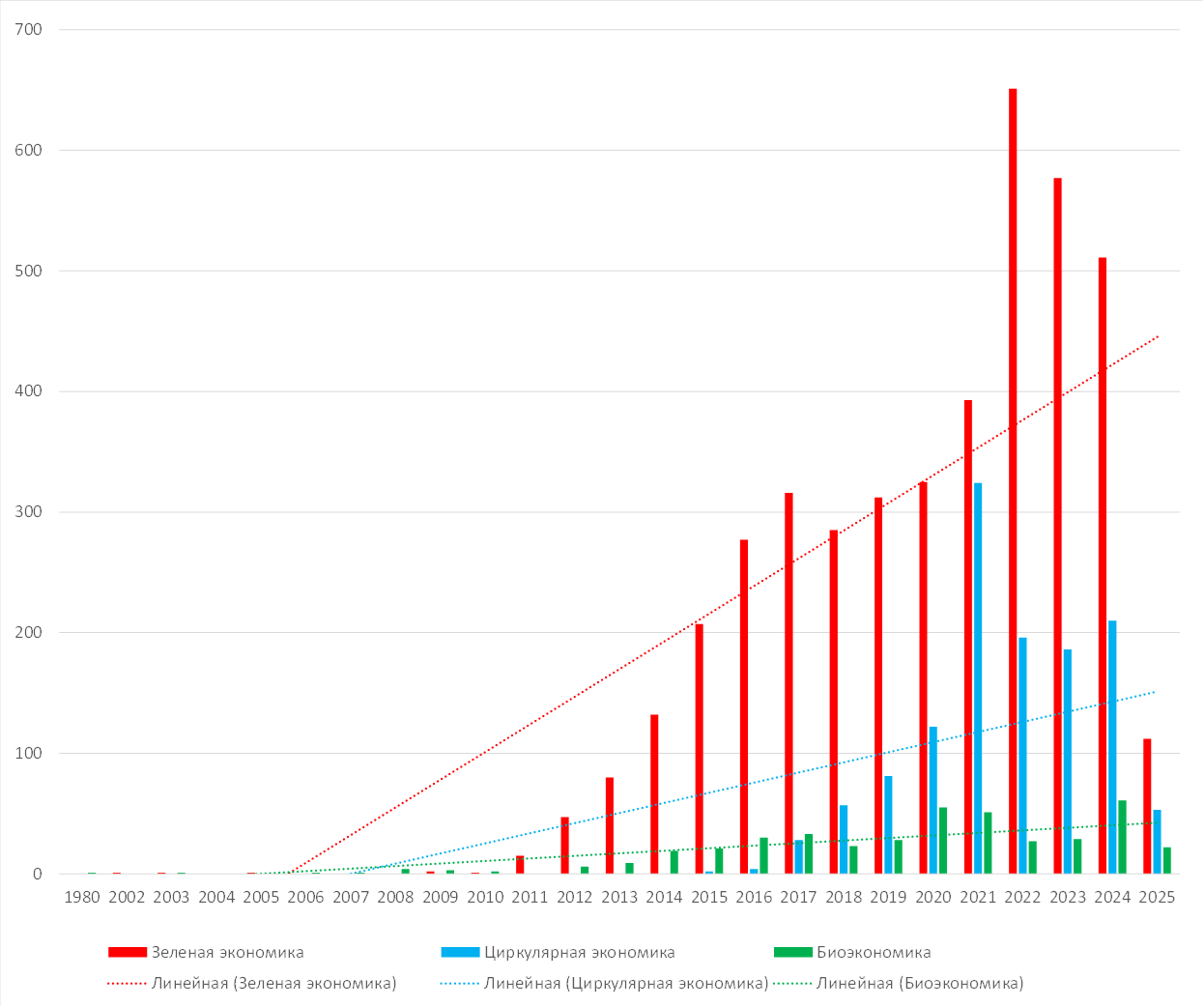 Рисунок 1. Анализ динамики частоты упоминания терминов «зеленая экономика», «циркулярная экономика» и «биоэкономика» в публикациях, размещенных на портале ELIBRARY.ru (в названии публикаций), число публикаций