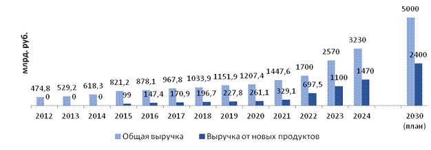 Использование рассмотренных принципов показало свою эффективность: выручка Госкорпорации «Росатом» по новым продуктам, также как и общая выручка, ежегодно увеличивается (рис. 1).