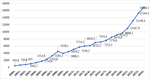 Рисунок 1 – Динамика производства строительной отрасли РФ, млрд. руб.