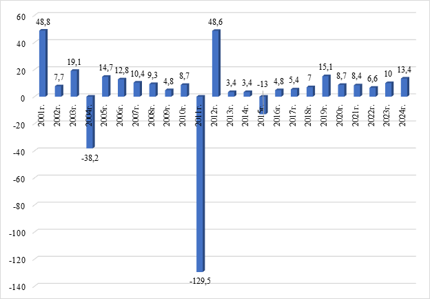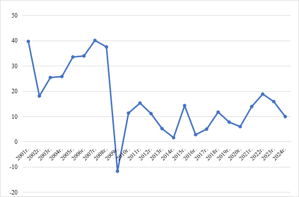 Данные графика демонстрирует кризисные состояния в 2010 году (особо остро), в 2016-м и в 2020- м.