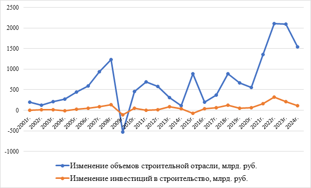 Ниже на рис. 3 показана динамика изменений в абсолютном выражении двух показателей: объема производства в строительной отрасли и инвестиций в эту сферу.
