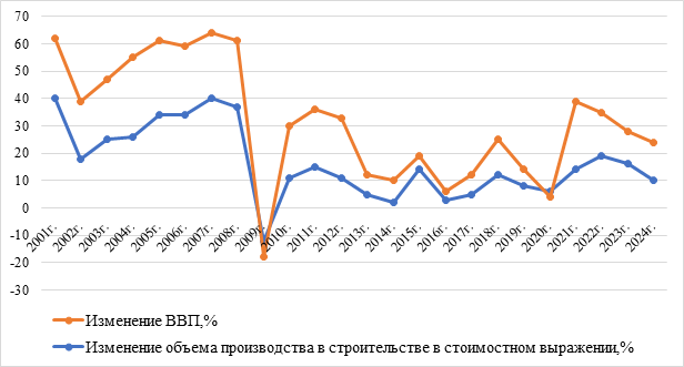 Рисунок 6 – Сопоставление динамики изменения производства в строительстве и динамики изменения ВВП, %